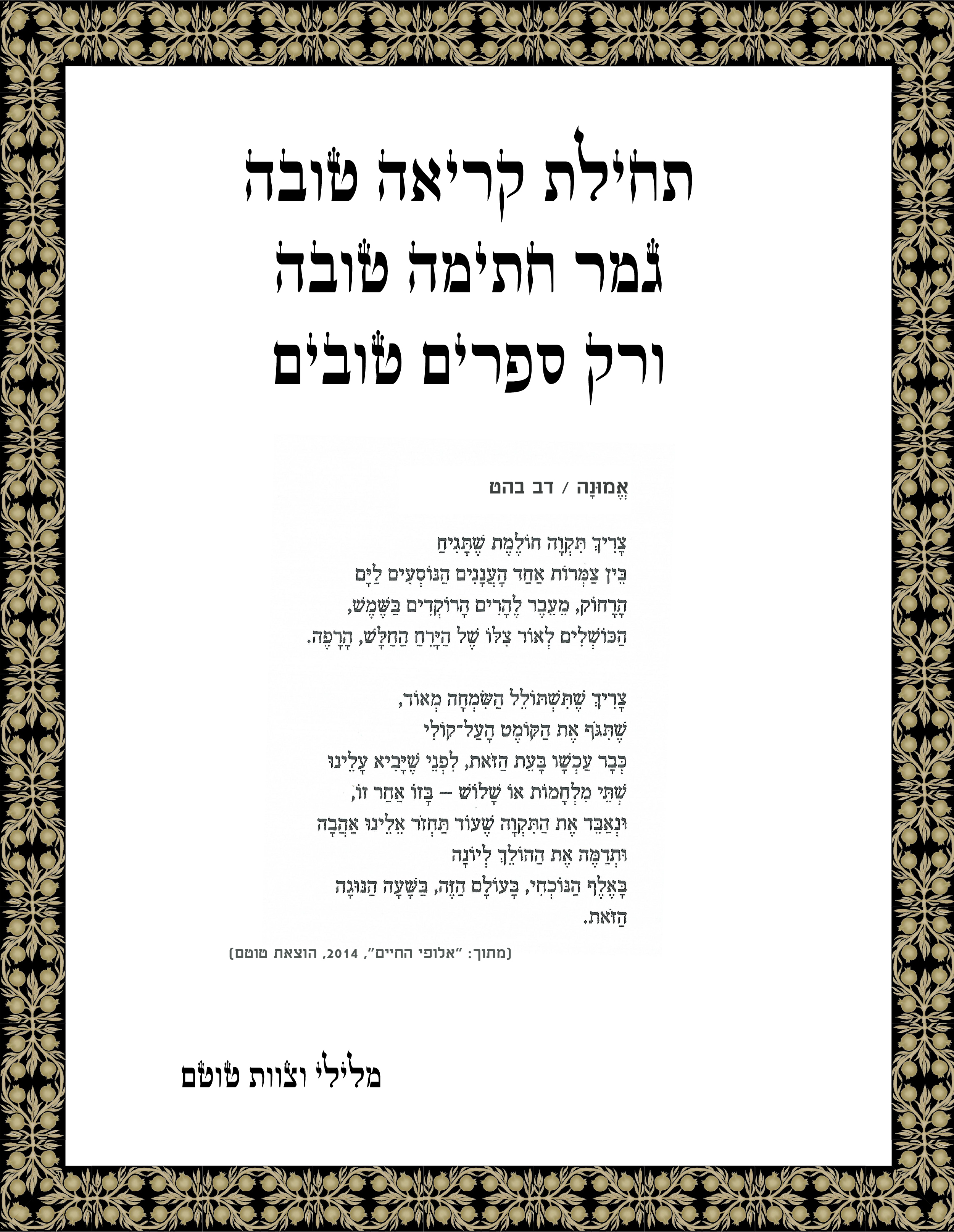 המשכנו לכרטיס הברכה לגמר חתימה טובה. לילי מטוטם ביקשה לשלב בברכה את השיר "אמונה" של הסופר והמשורר דב בהט, ששלושה מספריו ראו אור בהוצאה (אפשר ללחוץ על הכרטיסים כדי להגדיל ולקרוא). הוספנו את הברכה "תחילת קריאה טובה, גמר חתימה טובה ורק ספרים טובים". אוהד בחר בפונט בסגנון כתב סת"ם, שבו האותיות מעוטרות בכתרים. פה ישנם שני עיצובים, באחד מהם מסגרת של רימונים – מסמלי ראש השנה וקישוט מקובל לספרי תורה. גם כאן, שתי הגרסאות התקבלו ושימשו במקביל.