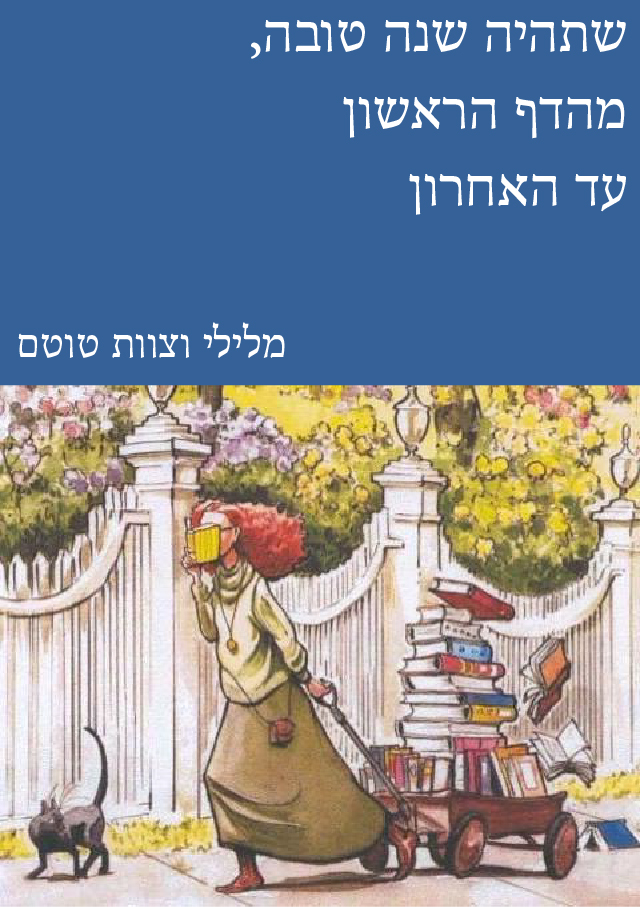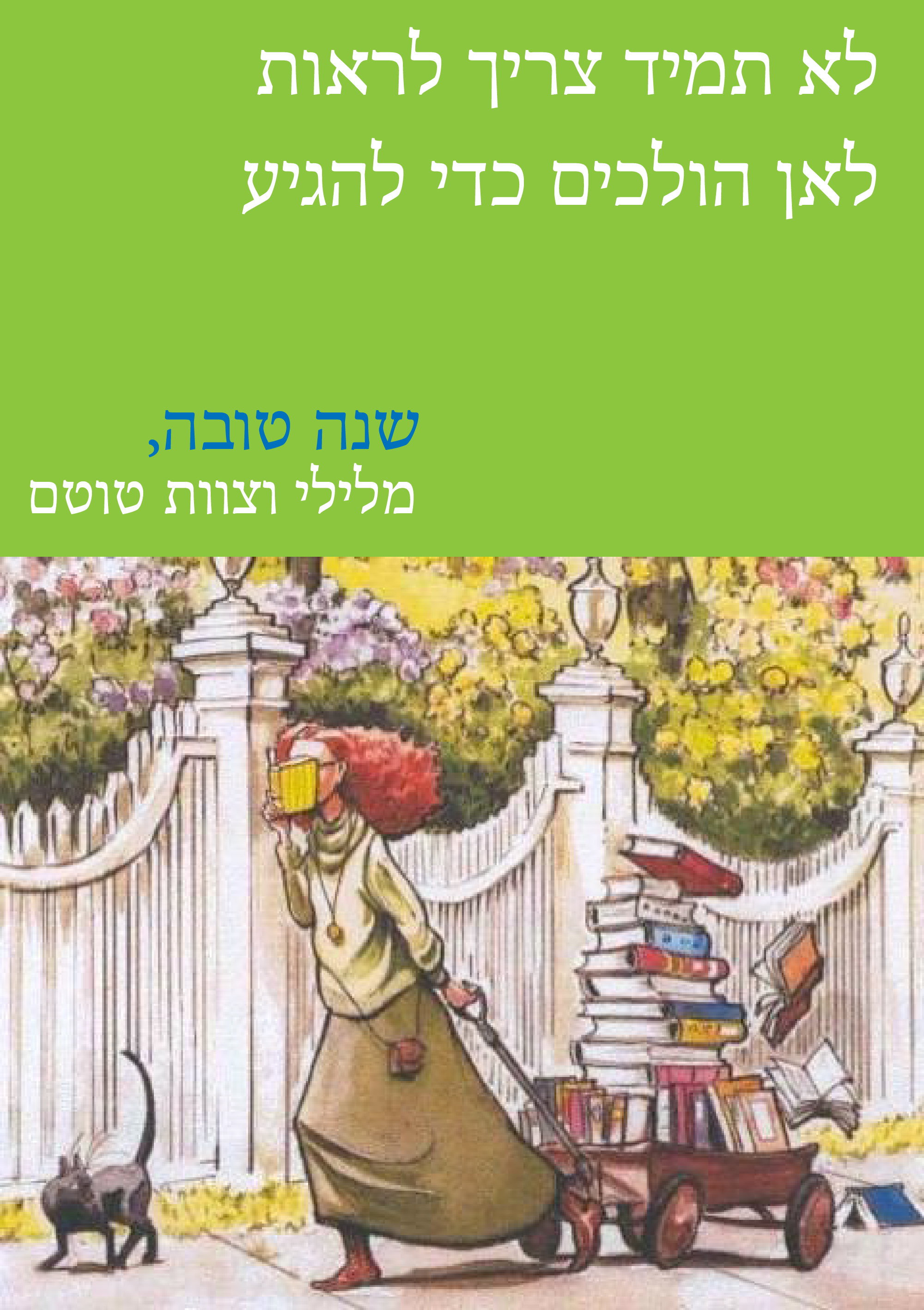 גייסתי אפוא את בן זוגי אוהד, שנוסף על כשרונותיו בתחום הקריאייטיב הוא גם מעצב הבית, והראיתי לו את התמונה שהתבקשנו להשתמש בה בכרטיס השנה-טובה. בעקבות תמונת האשה ההולכת תוך כדי קריאה, ניסח אחד מאיתנו את האפוריזם האופטימי "לא תמיד צריך לראות לאן הולכים כדי להגיע". האחרת מאיתנו הציעה ברכה מתאימה להוצאה לאור – "שתהיה שנה טובה, מהדף הראשון עד האחרון".
