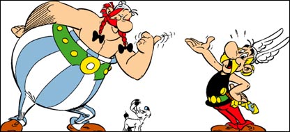 ובכל זאת, המאייר המדעי שהכין את האיור הראשון בחר לסמן את האנזים הפעיל בקווים הקצרים האלה, שאכן משדרים מרץ ודינמיות. סוג הסימון הזה מקובל מאוד בז'אנר אחר: הקומיקס. הסתכלו, למשל, על הפריים הזה מתוך הקומיקס "אסטריקס" (צייר אלבר אודרזו). אפשר להבחין בשני סוגים של קווים המקיפים את הדמויות: קווים מעוקלים המציינים תנועה (סביב כף היד של אובליקס), והקווים שהם למעשה טיפות דקות הניתזות מפניו של אסטריקס, המציינות מאמץ או התרגשות.