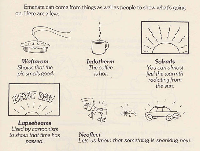 ווקר כתב את ספרו במידה מסוימת של בדיחות הדעת, אך הוא הפך לספר הדרכה פופולרי לסטודנטים לאמנות וליוצרי קומיקס, ורבים מהמונחים שבו נעשו מקובלים בתחום. אחד המונחים הכלליים יותר, emanata, מוסבר באיור שלפניכם, הלקוח מתוך ספרו של ווקר. emanata הם כל הסימנים היוצאים, כביכול, מחפץ או מאדם ומציינים את מצבו הפיזי או הנפשי: חם, ריחני, נבוך או שיכור.