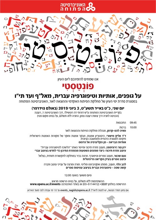 הפוסט הזה הוא למעשה הזמנה ליום עיון בנושא טיפוגרפיה עברית, ששמחתי לקחת חלק בעריכתו ובתכנונו ואשר יתקיים בעוד כחודש (יום שני, 3 ביוני) בקמפוס האוניברסיטה הפתוחה ברעננה. שותפותיי בעריכת יום העיון הן ראומה שחור ורותי שלם המעולות מההוצאה לאור של האוניברסיטה; יום העיון יתקיים ביוזמתה של מנהלת מחלקת הפיתוח וההוצאה לאור מאיה להט-קרמן, ואני מקווה שהוא יהיה מרתק ויעשה לתחום המופלא הזה את הכבוד המגיע לו.