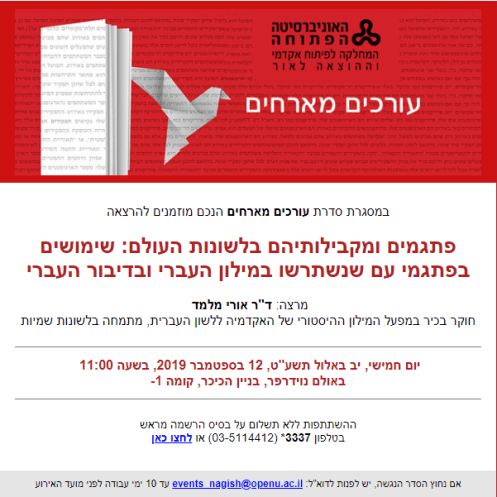 ובעניין אחר: הרצאתו של ד"ר אורי מלמד "פתגמים ומקבילותיהם בלשונות העולם: שימושים בפתגמי עם שנשתרשו במילון העברי ובדיבור העברי" תתקיים ביום חמישי 12.9.19 במסגרת סדרת "עורכים מארחים", בעריכתי, בקמפוס האוניברסיטה הפתוחה ברעננה. הכניסה בלא תשלום, קוראי הבלוג מוזמנים ביותר. פרטים בהזמנה וגם כאן.