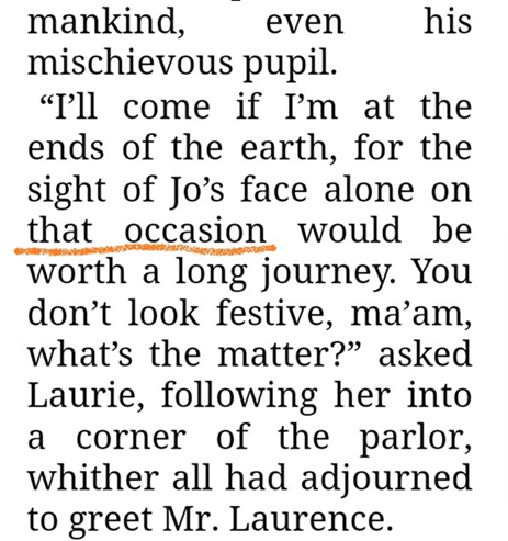 למראה החופה? האם מג מרץ', בת הכומר, עומדת להתחתן בטקס יהודי? מובן שלא; החופה השתלבה בתוכניות רק בתרגום לעברית. במקור נאמר פשוט "on that occasion".
