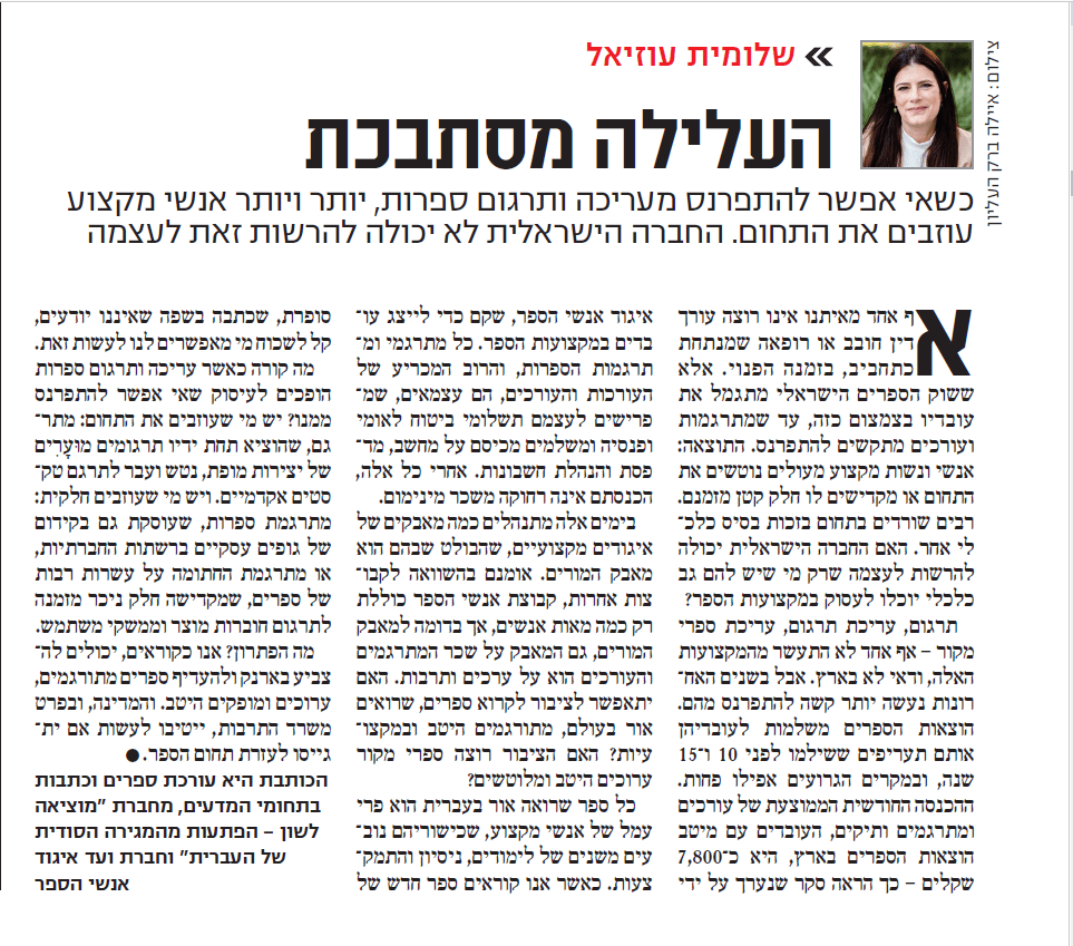 באחד האמשים פנתה אליי המתרגמת והעורכת חמוטל ילין בהצעה להצטרף לוועד איגוד אנשי הספר. האיגוד מייצג מתרגמים ועורכות, מגיהים, לקטוריות ונקדנים בתחום ההוצאה לאור המסחרית בארץ, במטרה לשפר את תנאי העבודה וההשתכרות של אנשי המקצוע המצוינים והחשובים האלה.