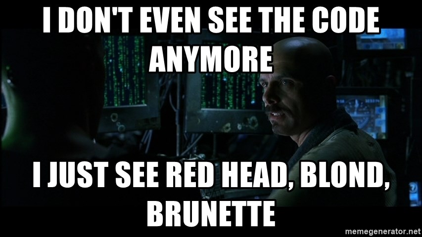בקטע זכור במיוחד בסרט "המטריקס", סַייפר מתבונן יחד עם ניאו במסכי מחשב שעליהם רצות שורות קוד, המייצגות את המציאות המדומה שרוב בני האדם חיים בה. "אני כבר לא רואה את הקוד," הוא אומר לניאו. "אני רואה רק בלונדינית, ברונטית, ג'ינג'ית…".
