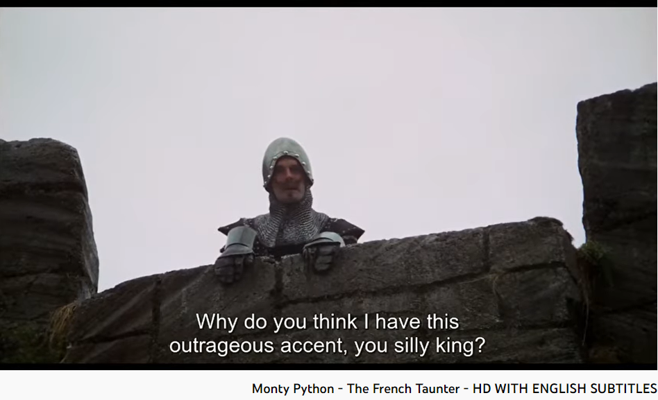 בתמונה שבראש הפוסט: ג'ון קליז מצחיק עד דמעות בתפקיד The French Taunter ב"מונטי פייטון והגביע הקדוש".