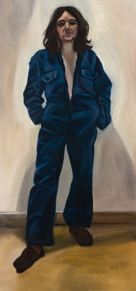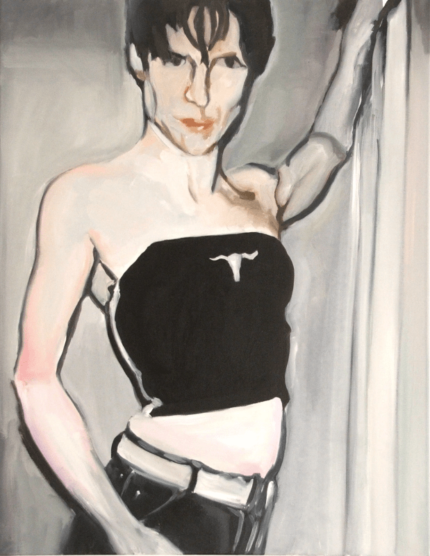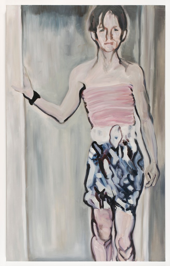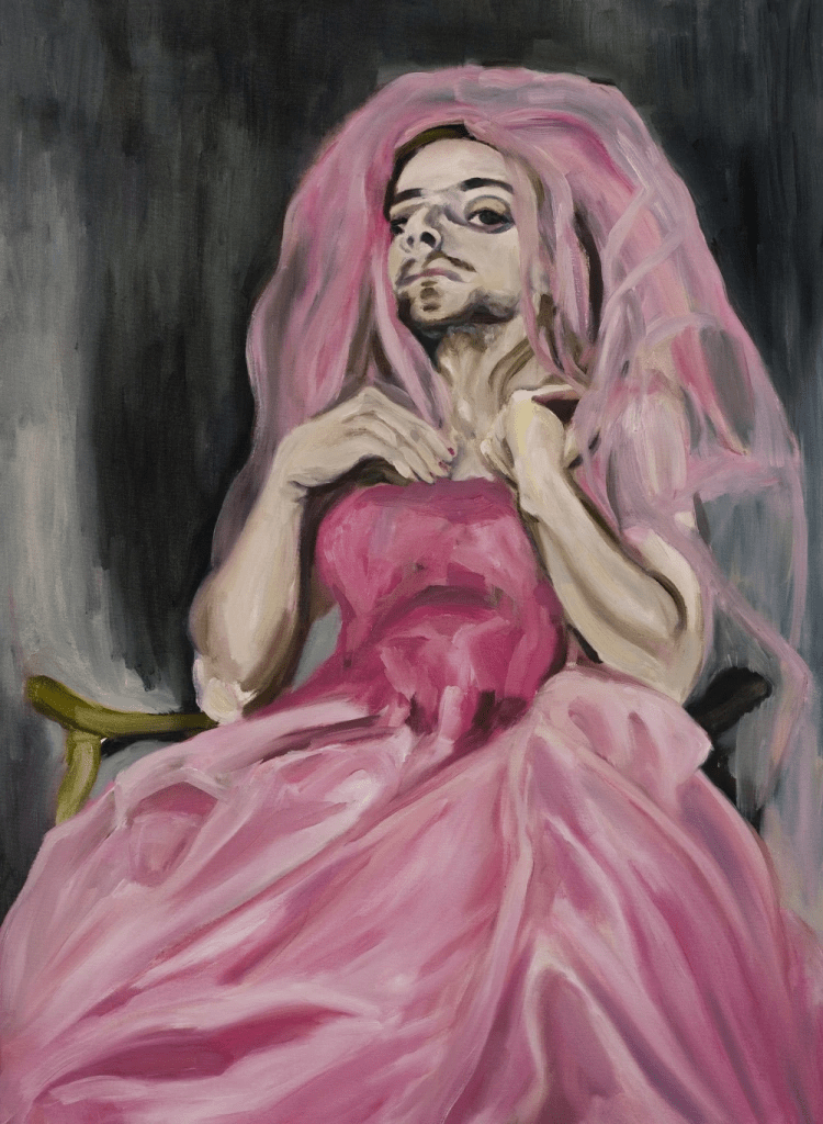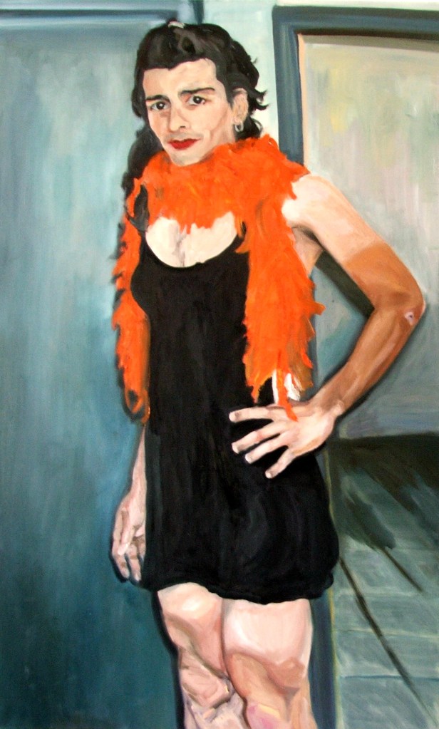 במילה "מגדר" נזכרתי היום כאשר התבוננתי בכמה מיצירותיה של טליה רז, אחותי האמנית, שרבות מהן מתארות דמויות שהמגדר שלהן עמום או אינו בינארי – כמו התמונה שלמעלה, "הדוויג בחולצת סטרפלס", ו"אדם בשמלה ורודה" ו"אוברול", שבהמשך.