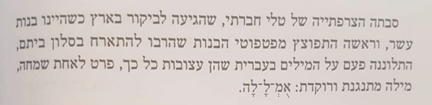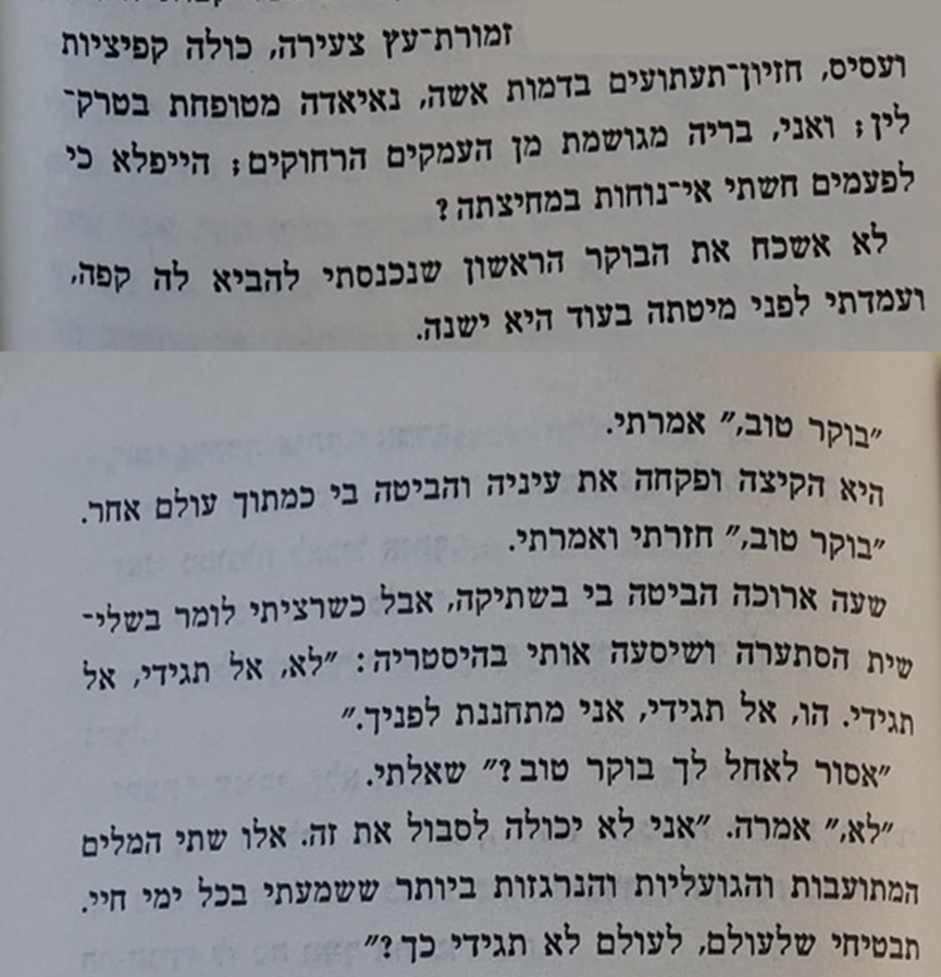 "בעשר שעות יקום אבי, יחליק שערותי ויאמר ועתה שכבי נא תרצה. מה אהבתי ו"ו החיבור, תמיד שמחתי עליה. כאילו כל אשר אמר אלי אבי המשך מהרהורי לבו הוא. לאמור בלבו דיבר עמי תחילה ועתה פה אל פה." (ההדגשה שלי.)