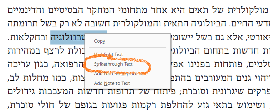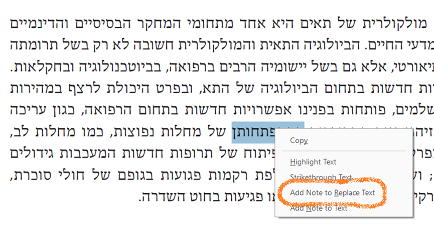 בעבודה על פידיאף השתמשתי עד היום במחיקה בקו חוצה, וכדי לסמן הוספת טקסט או כל שינוי אחר – בפתקית צהובה עם הסבר מה צריך לעשות. ובכן, מתברר שיש דרך טובה יותר. תודה לעינת פרלמן רוגל מהסטודיו באוניברסיטה הפתוחה שהאירה את עיניי, וכך עושים (שימו לב, הכלים האלה נמצאים בגרסה החינמית, האקרובט רידר. אין צורך בגרסה בתשלום):