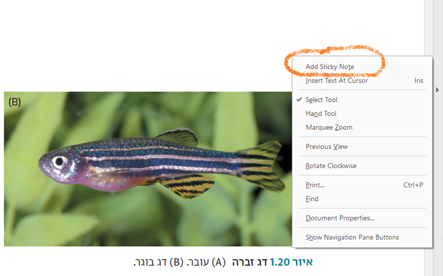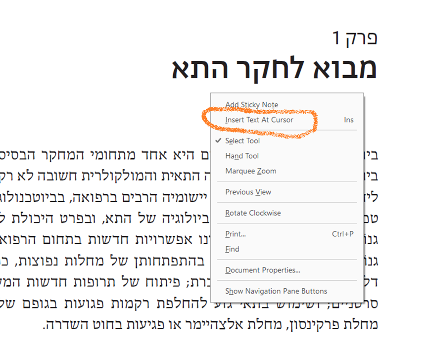 כדי להוסיף טקסט – עומדים במקום המתאים בפידיאף, לוחצים על עכבר ימני ומקבלים את התפריט הזה. בוחרים את האפשרות המסומנת, להלן "להוסיף טקסט במקום שבו נמצא הסמן". אם בגרסת האקרובט שלכם אין אפשרות כזו (שאלה של גרסה), דלגו לכלי הבא המתואר כאן, שתי תמונות הלאה, שמספק את אותה תוצאה.