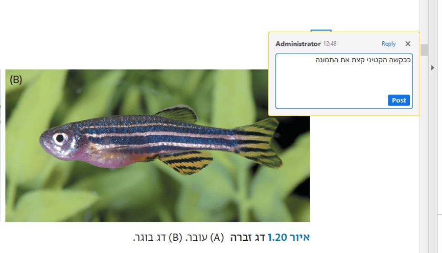 בחרו מתוכו את האפשרות המסומנת. הטקסט שבחרתם יסומן בקו חוצה, ולידו תופיע צורת ה"מזרקה" שאתם רגילים לסמן בעט על נייר. כאשר תלחצו עליה תקבלו תפריט קטן. בחרו מתוכו את איקון הפתקית. בחלון שיופיע, כתבו את הטקסט החדש. כעת, שוב, הגרפיקאי יכול פשוט לשאוב את התיקון, כמו שהוא, לתוך קובץ העבודה שלו.