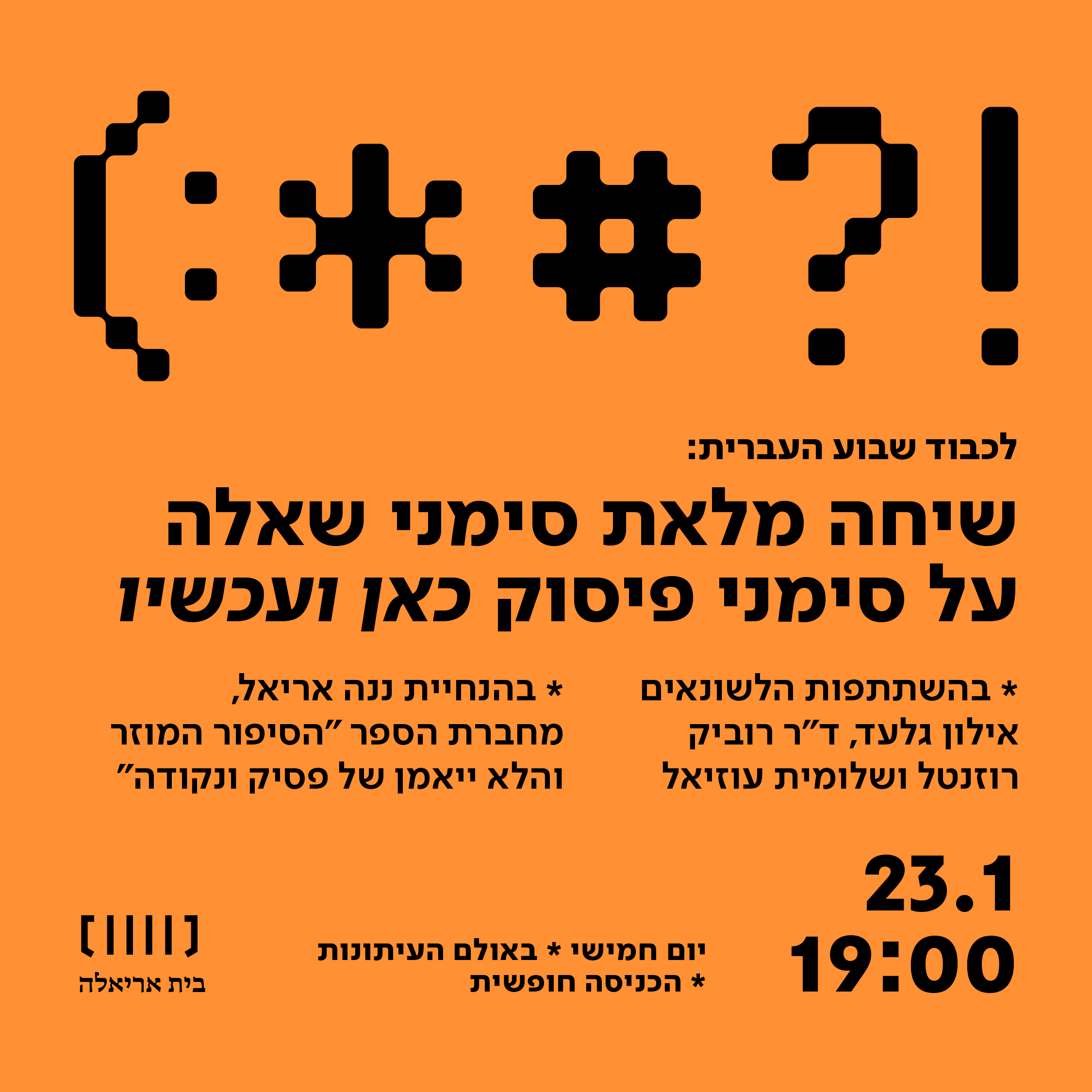 וביום חמישי השבוע, כלומר בעוד יומיים (23.1, 19:00), יתקיים בספריית בית אריאלה מפגש פסגה בלתי רגיל בנושא סימני פיסוק. ננה אריאל, מחברת "הסיפור המוזר והלא ייאמן של פסיק ונקודה", תנחה, ורוביק רוזנטל, אילון גלעד ואנוכי נשוחח. הכניסה חופשית, כל הפרטים בהזמנה שלמעלה, מוזמנות ומוזמנים.